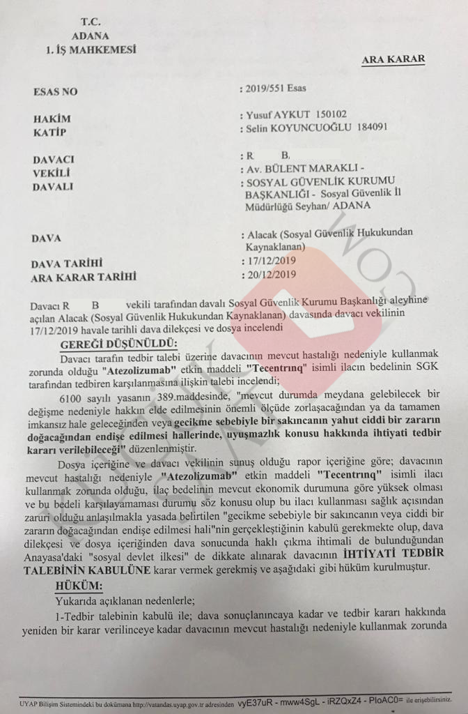 R.B'nin Avukatı Bülent Maraklı konuyla ilgili yaptığı açıklamada, Adana İş Mahkemesi'nde açılan davada aynı gün "Anayasadaki Sosyal Devlet" ilkesine göre "İhtiyati tedbir" talebini kabul ederek tedbir kararı sonrasında ilaç bedelinin kurum tarafından karşılanması gerektiği kararının verildiğini söyledi.