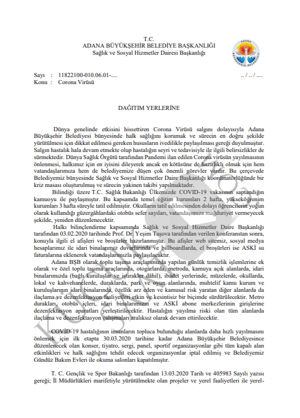 - ilk etapta 30.03.2020 tarihine kadar Adana Büyükşehir Belediyesince düzenlenecek olan konser, tiyatro, sergi, panel, sportif organizasyonlar gibi tüm kapalı alan etkinlikleri ve halk sağlığını tehdit edecek organizasyonlar iptal edilmiş ve Belediyemiz Gündüz Bakım Evleri ile okuma salonları kapatılmıştır.