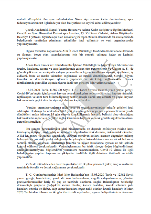 - Çocuk Akademisi, Kapalı Yüzme Havuzu ve Adana Kadın Gelişim ve Eğitim Merkezi, Gençlik ve Spor Hizmetleri Dairesi spor kursları, 75. Yıl Sanat Galerisi, Adana Büyükşehir Belediye Tiyatrosu, ziyarete açık olan konaklar gibi toplu etkinlik alanlarında bu süre içerisinde belediyemiz tarafından planlanan etkinlikler iptal edilmiştir ve yeni organizasyonlar yapılmayacaktır.