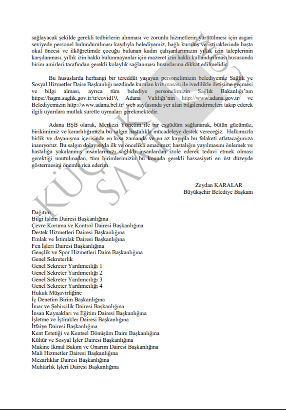 Adana Büyükşehir Belediye Başkanı Zeydan Karalar'dan tüm birimlerde dağıtılmak üzere koronavirüs özel genelgesi gönderildi.