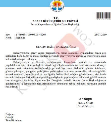 Adana Büyükşehir Belediyesi Genel Sekreteri Şaban Acar'ın imzasıyla tüm birimlere gönderilen yazıda mesai saatlerine uymayanların tespit edilmesi istenildi.