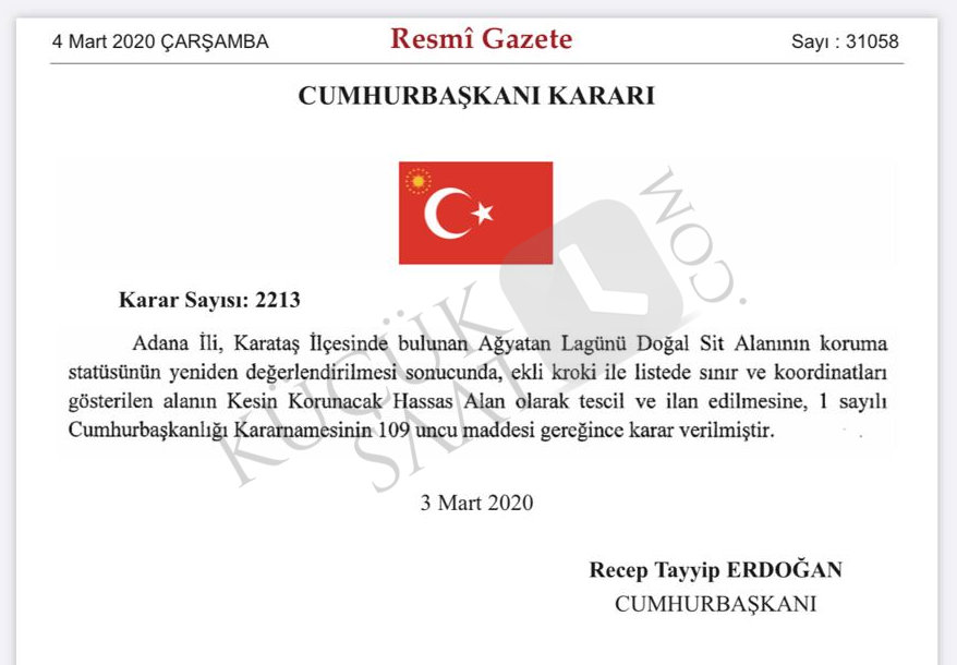 4 Mart 2020 tarihli Resmi Gazete'de yayımlanan Cumhurbaşkanı Kararı ile Adana ili Karataş ilçesinde bulunan Ağyatan Lagünü Doğal Sit Alanının koruma statüsü yeniden değerlendirildi.