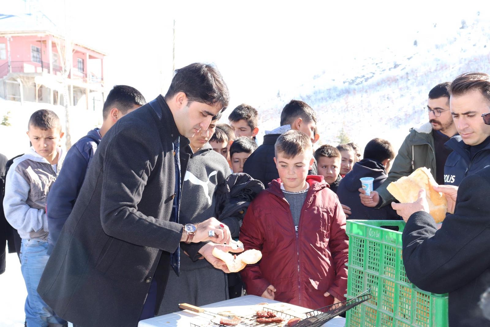 Kaymakam Sevgili, kurum amirleri ile birlikte öğrencilere sucuk ekmek ikramında bulundu.