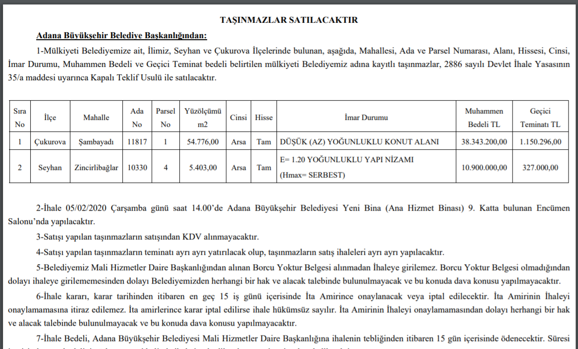İmar düzenlemesi ve yoğunluğun artmasıyla birlikte ciddi rakamlara ulaşan arsa getirisinden faydalanmak isteyen Adana Büyükşehir Belediyesi, takriben 50 Milyon TL bedelindeki iki arsasını satışa çıkardı.