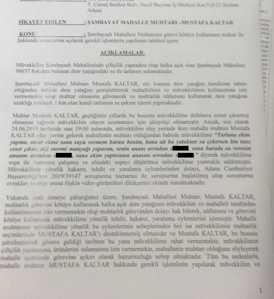 Arazisini sulamak isteyen engelli vatandaşın üzerne küfür, şantaj ve tehdit dolu cümlelerle yürüyen, bununla da kalmayıp engelli vatandaşı darp eden Şambayadı Mahallesi Muhtarı Mustafa Kaltar’ı medya organları elindeki sopalı fotoğrafıyla servis etti. Dolayısıyla haberimizin detayında büyük iddialar, kamuoyun dikkatine yeterince sunulmadı.