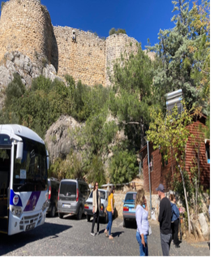 Rehberimizin kulak okşayan, “Haydi otobüslere, arkadaşlar!” uyarısıyla araçlarımıza bindik. Bu kez Kozan Kalesi’nin bulunduğu dağın ağaçlı yollarında yılan gibi kıvrıla kıvrıla tırmanmaya başladık. Dağın sırtında yükseldikçe Kozan aşağıda kalıyor, binalar küçülmeye başlıyordu. Şimdi Kalenin eteklerindeki tesislerin önündeydik ve teraslardan Kozan’ı kuşbakışı seyredip fotoğraflar çekiyorduk.