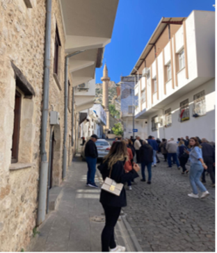 Güler yüzlü, tatlı dilli rehberimiz Emine Karafakıoğlu önümüze düştü, caminin tüm özelliklerini ahmağa anlatır gibi, pardon pardon, öğrenciye ders anlatan bir öğretmen gibi bir bir anlattı. Zaten kendisinin atanmayan öğretmenlerden olduğunu daha sonra öğrenecektim. Arkasından caminin yanı başında restore edilmiş konakların olduğu tarihi sokakları gezdik. Herkesi derin bir kedere sürükleyen fırının öyküsünü anlatmaya ise dilim varmıyor.