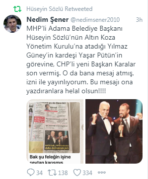 Pütün'ün "bak şu feleğin işine, şeytan karışmış herhalde, kıyım bizden başladı" mesajını Nedim Şener'e attığı, Nedim Şener'in bunu paylaştığı twiti ise Hüseyin Sözlü'nün kendi hesabında paylaşması (RT) dikkatleri çekti.
