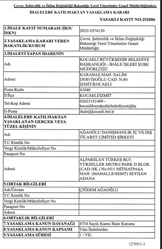 Kocaelispor tesis ihalesinde en düşük teklifi veren Adanalı danışmanlık ve ticaret şirketi olan Ağaoğlu Danışmanlık, Resmi Gazete kararıyla tüm ihalelerden men edildi.