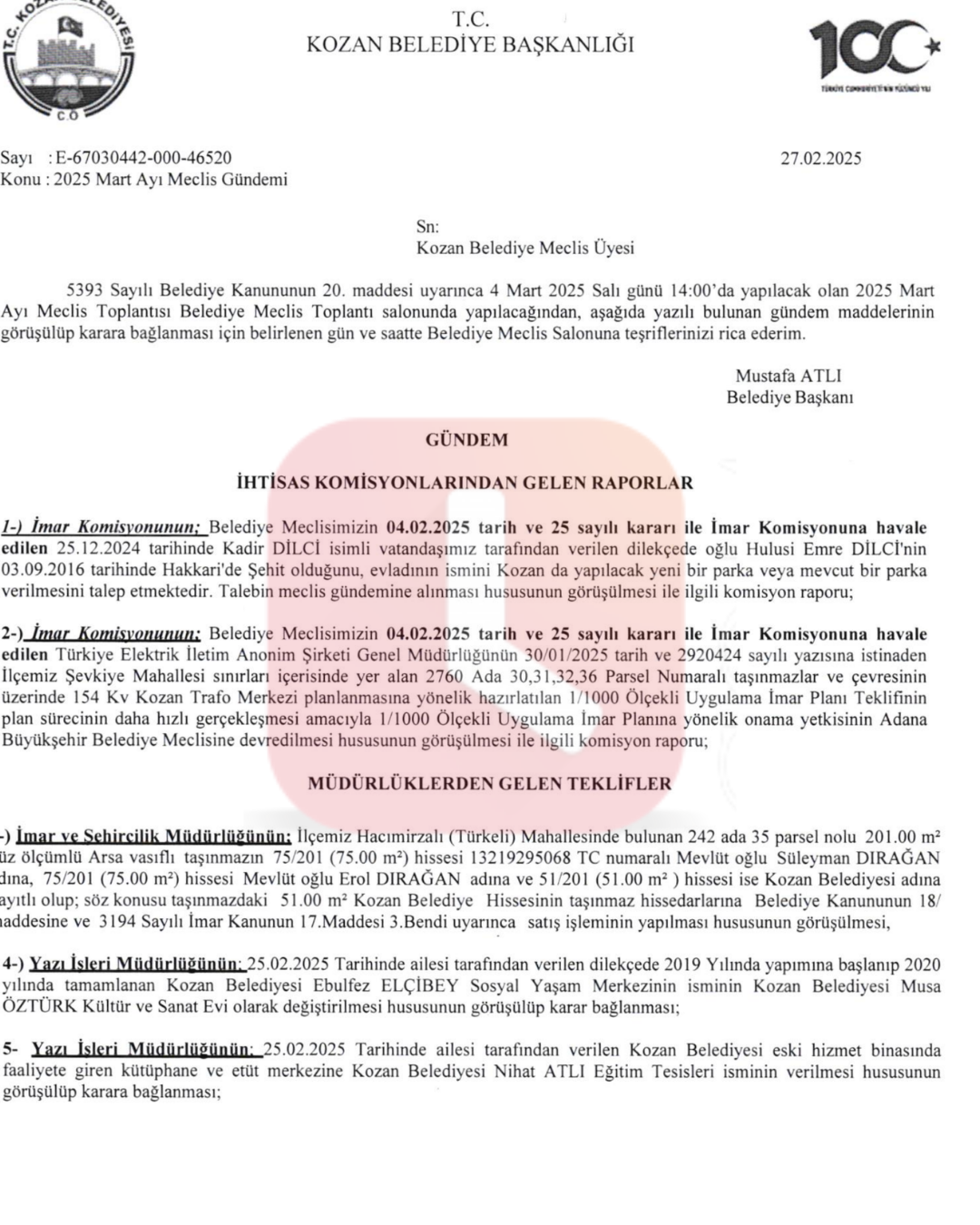 Kozan Belediye Başkanı Mustafa Atlı, dilekçeyi işleme koyarak 27.02.2025 tarihli olur ile Kozan Belediye Meclisi’nin de görüşmesi üzere dördüncü madde olarak, Musa Öztürk’ün ailesinin istemini meclise havale etti.