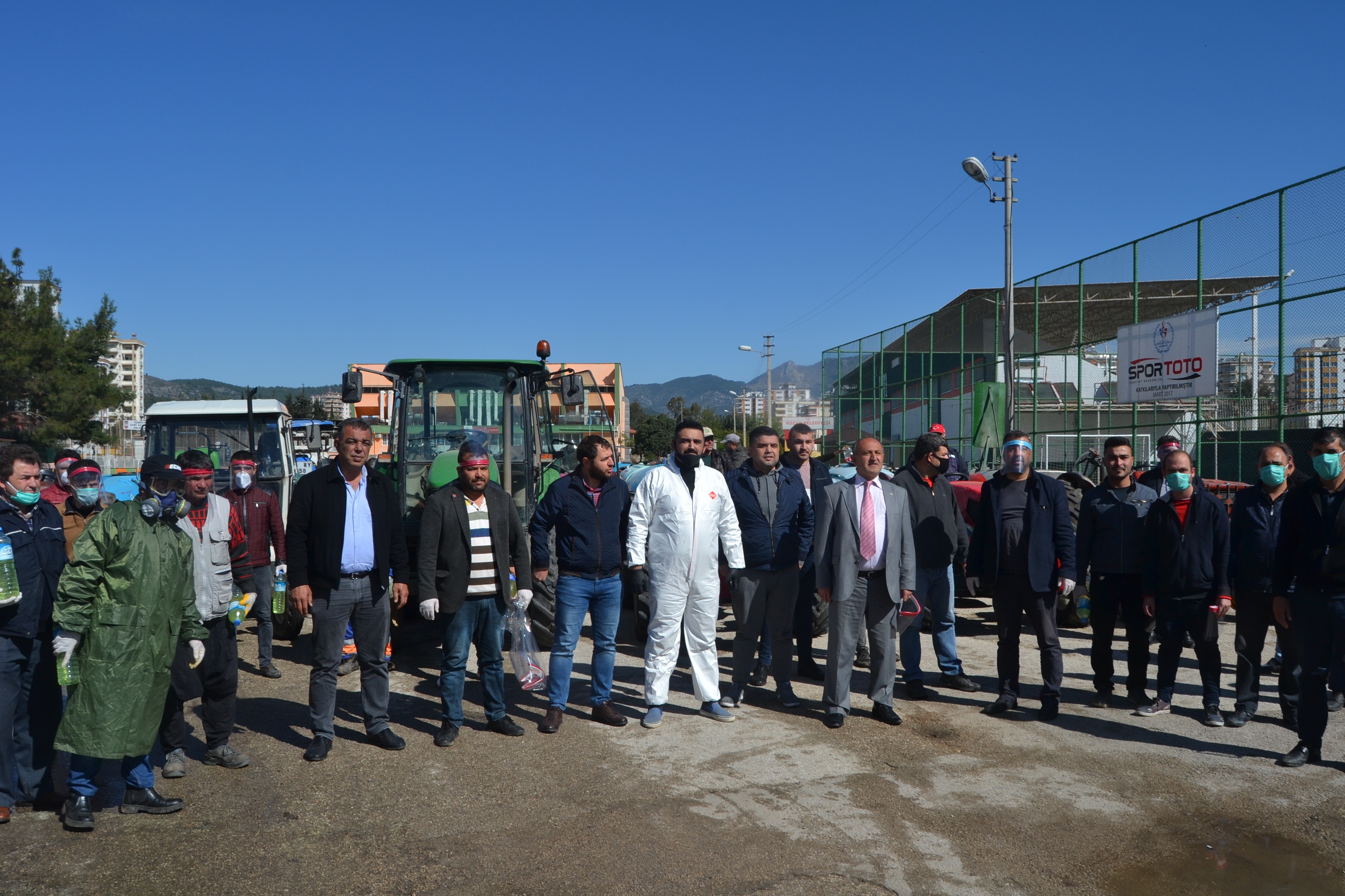 Kozan merkezdeki tüm cadde ve ara sokaklarda Korona virüs salgınına karşı dezenfekte çalışması yapacak olan çiftçiler, Kozan İlçe Gençlik Spor Müdürlüğü önünde bir araya geldi.