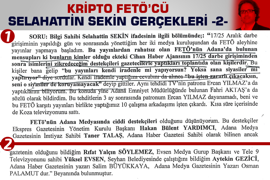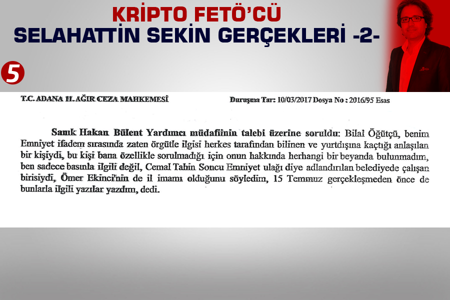 İftiracı müptezel Selahattin Sekin, 17-25 Aralık sonrasında aleni FETÖ’cülükten kripto FETÖ’cülüğe geçiş yaparken, 15 Temmuz 2016 hain darbe girişimi sonrası kendini gizleyebilmek ve Adana basınında kendine yeni bir alan açmak için emniyete giderek Adana’nın en güçlü ve saygın gazetecilerini FETÖ’cülükle itham eden iftiraları söylemekten çekinmemiştir.