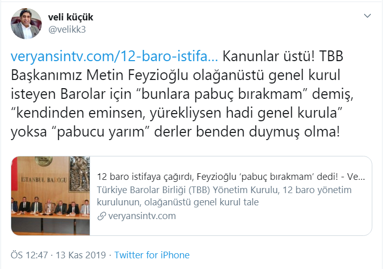 İddia ediyorum bu 12 baronun yönetim kurulu halktan da kendi meslektaşlarından da kopmuştur. Meslektaşlarının sorunlarını çözmek amaçları yoktur, sorunların çözülmesine karşı rahatsızlıkları vardır. Arkamızda Türk milleti, avukatların ezici çoğunluğu vardır”