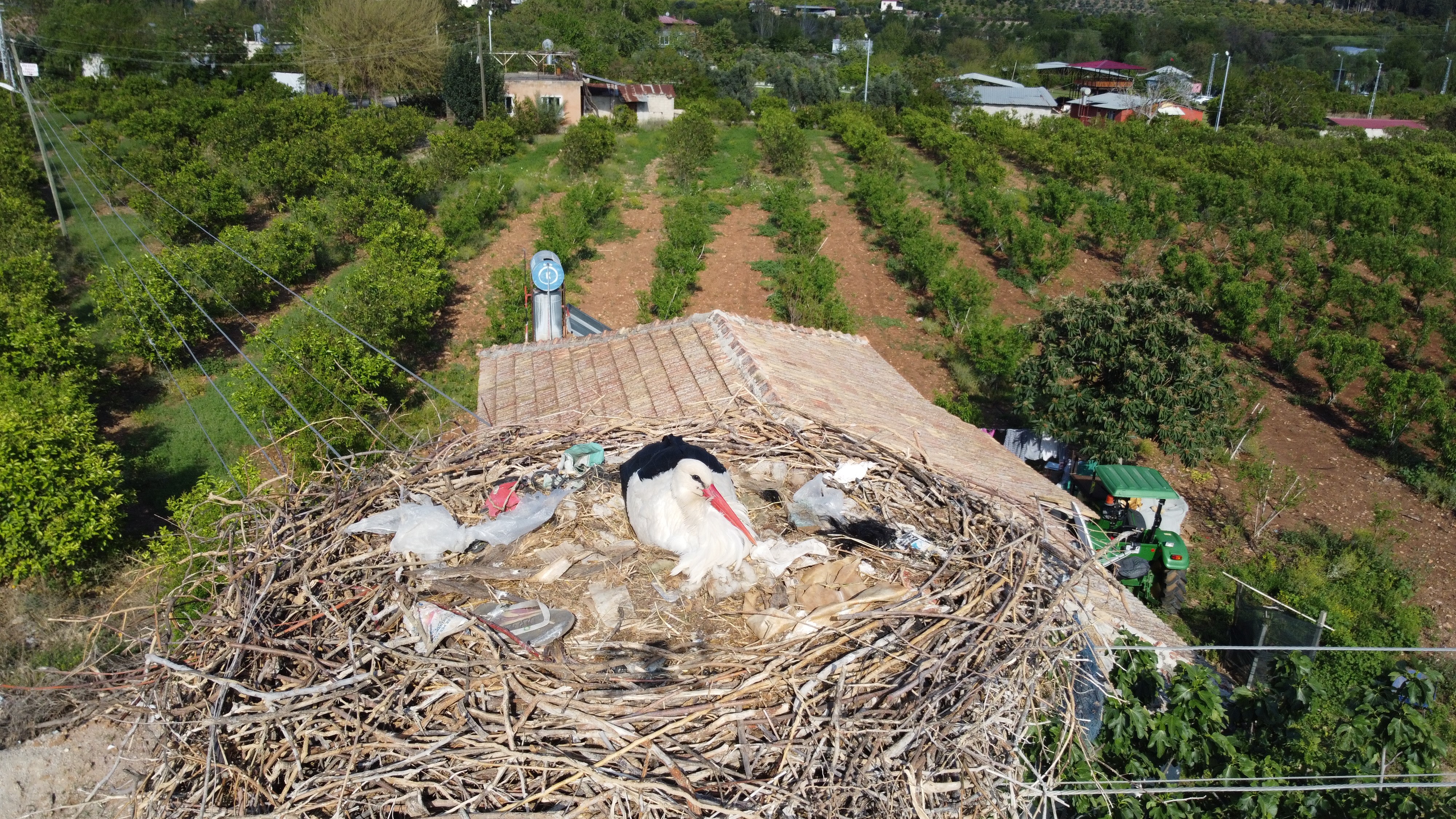 İlçeye bağlı Acarmantaş Mahallesi'ndeki direğe yuva yapan ve çevre sakinlerince 'Portakal ailesi' ismi verilen leyleklerin yuvası dikkat çekti. Kısa sürede yuvalarına çok sayıda poşet gibi atık malzemeleri taşıyan leyleklerin terliği bile getirdiği dron ile çekilen görüntülere yansıdı. Leyleklerin adeta çöplerden kendilerine yaptığı yuva, insanların doğaya verdiği zararı da gözler önüne serdi.