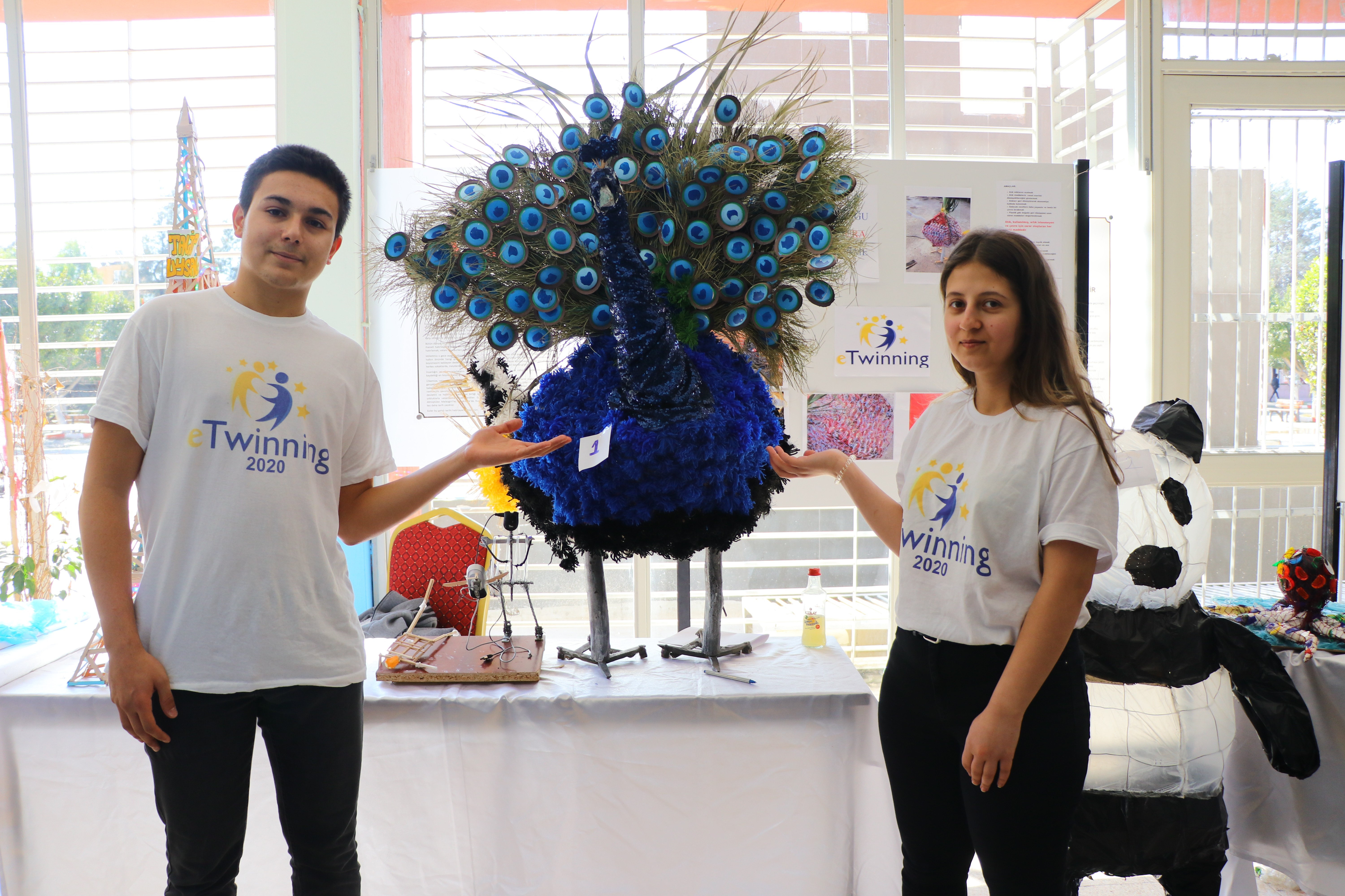 38 öğrenci gruplara ayrılarak görsel sanatlar dersinde geri dönüştürülebilen atık maddelerden yaklaşık 4 ayda 17 eser yaptı. Poşetten panda, pillerden robot, cam kırıkları ve kapaklardan insan, pet şişeden tavus kuşu ise bu eserlerden bazıları.