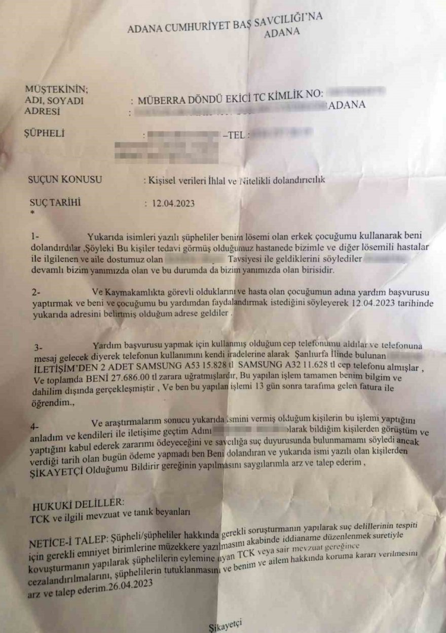 Adana'da bir çift, sahte kartlarla kendilerini devlet memuru olarak tanıtıp, lösemili 10 yaşındaki çocuğun ailesini maaş bağlatma vaadiyle dolandırdı. Dolandırıcılar, küçük çocuğun ailesini bir GSM operatörü üzerinden yaklaşık 30 bin liralık cep telefonu alarak zarara uğrattı.