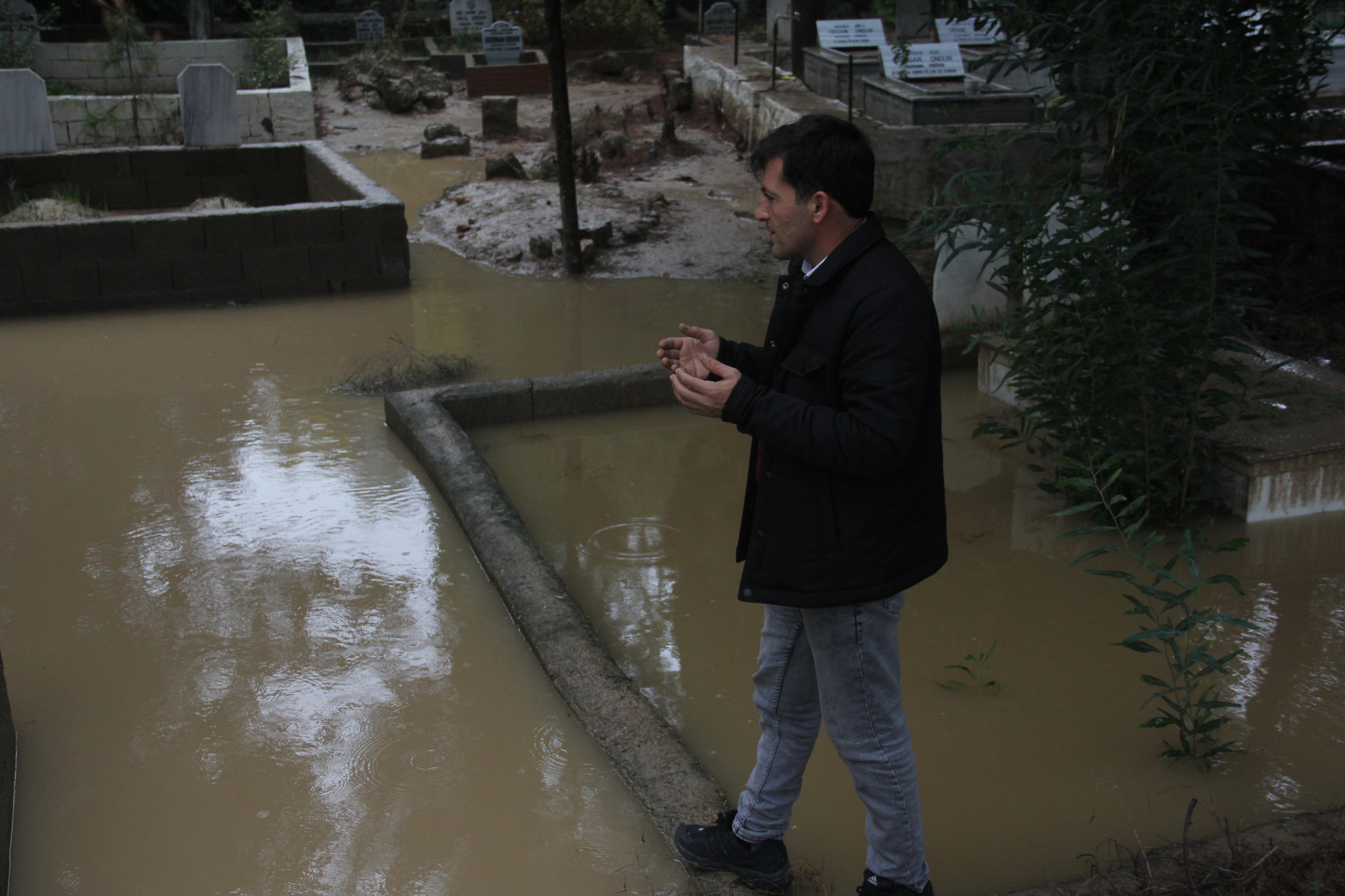 Bazı mezarların ise etrafına örülen duvarların yıkıldığı görüldü. Sular içinde kalan mezarların sadece isim taşı görünüyor. Mezarlığa gelen vatandaşlar yakınlarının kabristanlarına ulaşamadı.