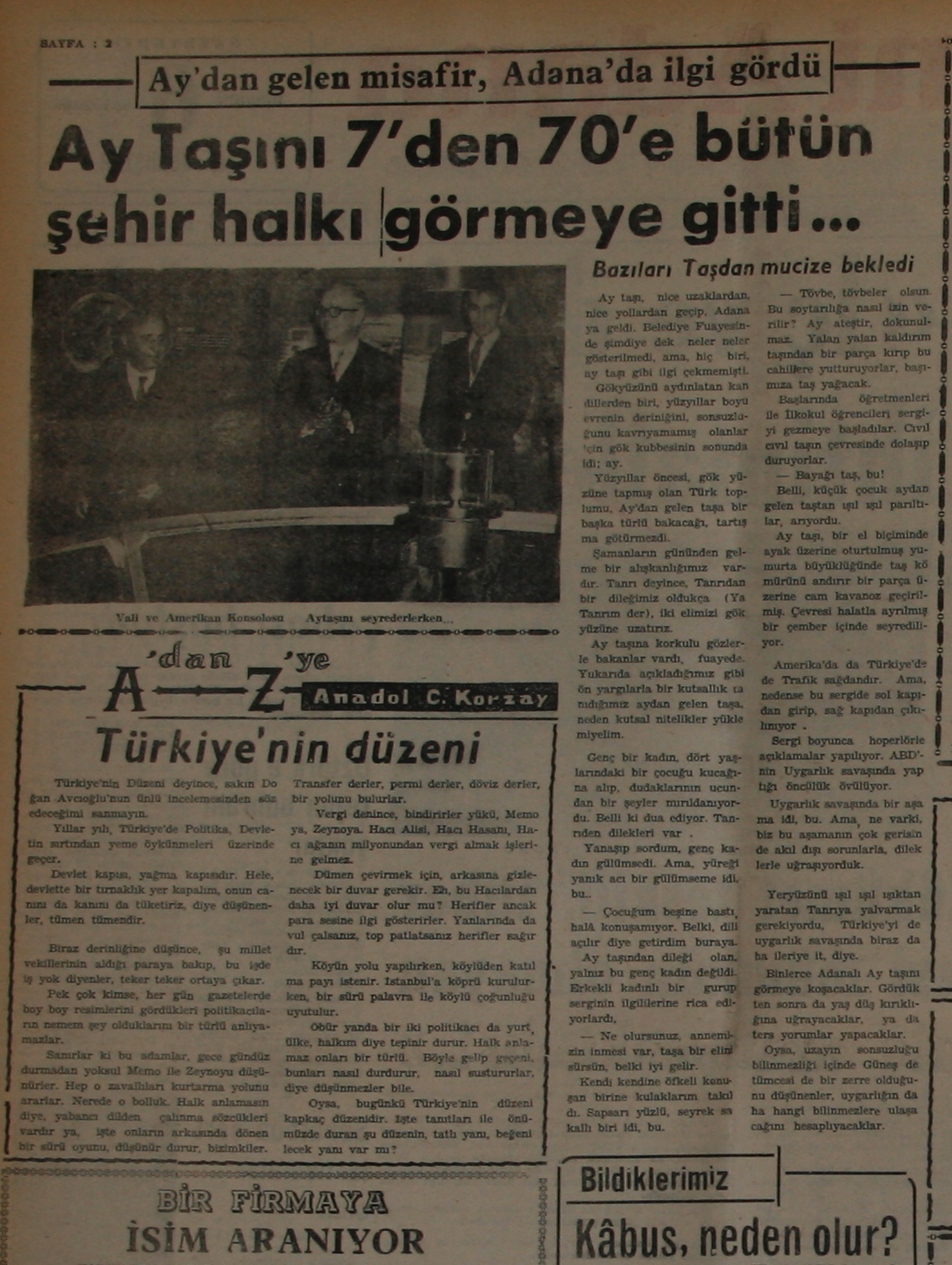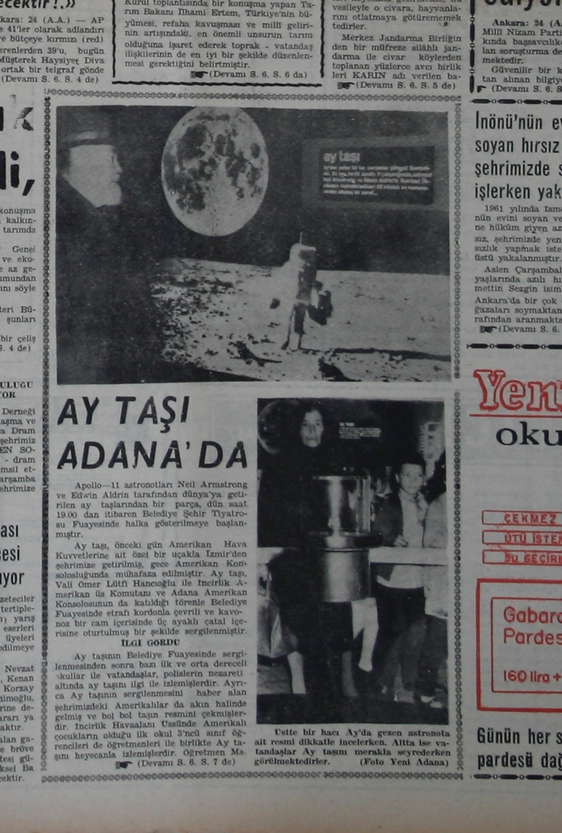 Hava Kuvvetlerine ait özel bir uçak, Ay Taşı'nı İzmir'den almış ve Adana'ya getirmişti. Gece Amerikan Konsolosluğunda muhafaza edilen Ay Taşı, sabah, Vali Ömer Lütfi Hancıoğlu, Amerikan Konsolosluğu, şehrin ileri gelenleri ve halkın yoğun ilgisi altında yapılan bir törenle, etrafı kordonla çevrili kavanoz bir cam içerisinde üç ayaklı bir sehpaya konuluyordu.
