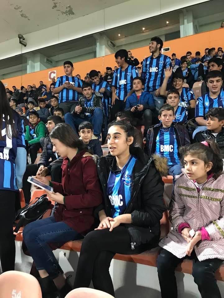 İHH yönetimi 5 Ocak Stadyumu'nda çocuklarla birlikte yerlerini aldı. hayli heyecanlı olduğu görülen çocukların sevinçleri tribünlere yansıdı.