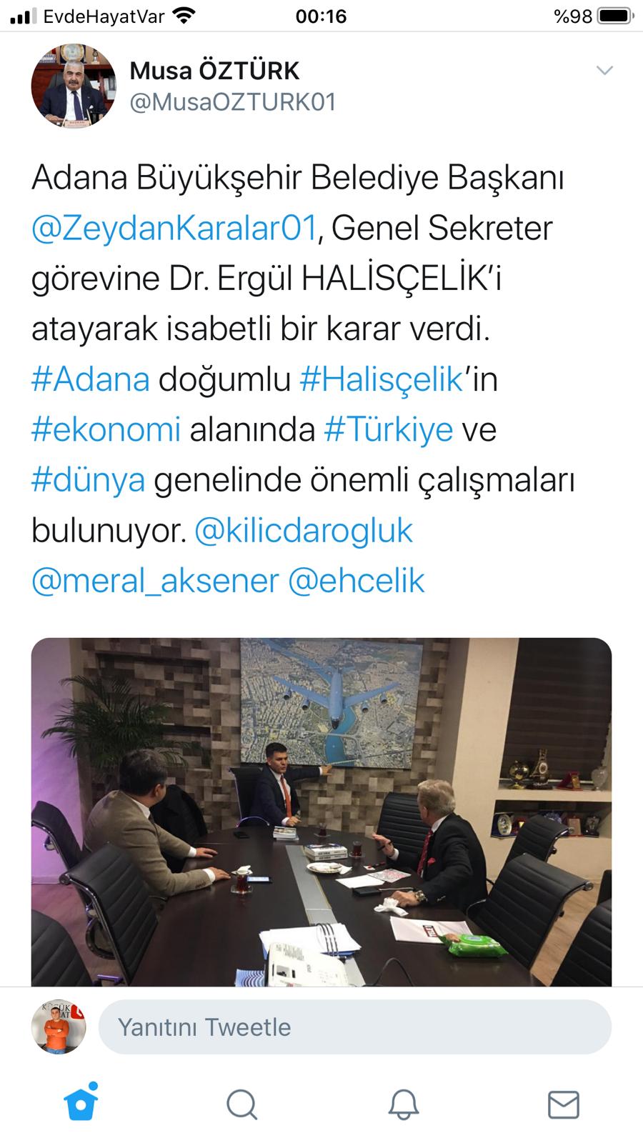 Eski başkan Musa Öztürk destek mesajında, "Adana Büyükşehir Belediye Başkanı Zeydan Karalar, Genel Sekreterlik görevine Dr. Ergül Halisçelik'i atayarak isabetli bir karar verdi. Adana doğumlu Halisçelik'in ekonomi alanında Türkiye ve Dünya genelinde önemli çalışmaları bulunuyor" dedi.