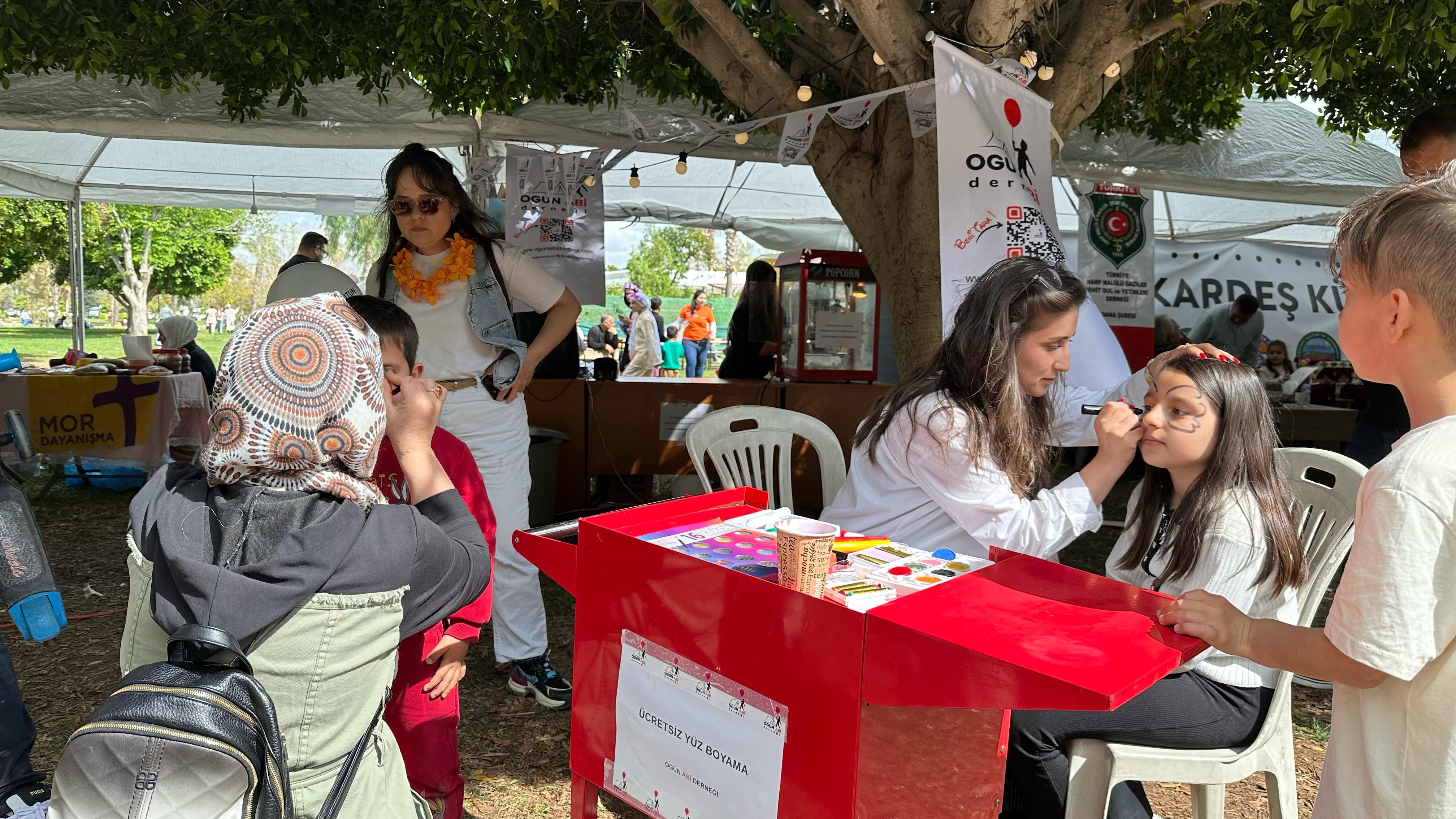 Adana'da faaliyet gösteren Ogün Abi Derneği, Portakal Çiçeği Karnavalı'nda stant açarak çocuklara yüz boyama yapıp oyunlar oynatıyor.