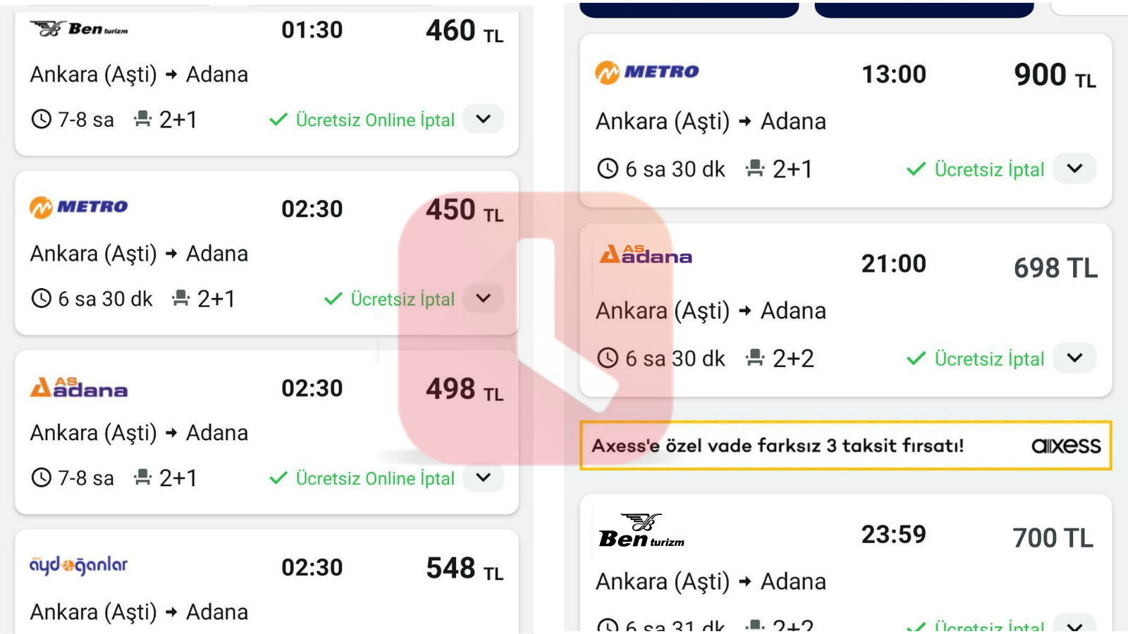 Ankara - Adana arası 14 Mart Cuma günü 400-500 TL bandında iken, bayram yaklaştığında ise ( 26-27-28 Mart ) bazı firmaların bu fiyat tarifesini iki katına çektiği, bazı firmaların ise, %50'si kadar zam yaptığı görüldü.