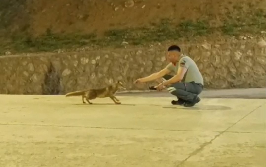 Adana’nın Tufanbeyli ilçesinde özel güvenlik görevlisi yanına gelen tilkiyi kendi eliyle besliyor