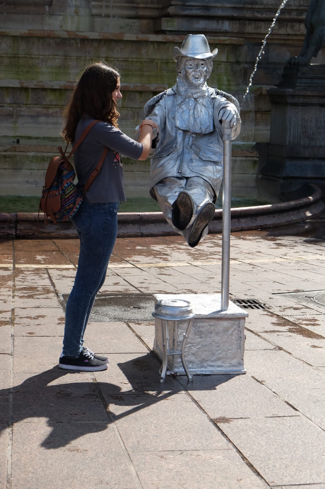 Biraz daha yürüyorum. İleride, meydanda heykel gibi hareketsiz, açık gri renkli bir köstüm giymiş ve havada asılı duruyormuş hissi veren bir kadına rastlıyorum.