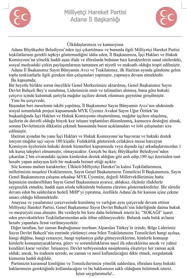 MHP Adana İl Başkanlığı, Adana Büyükşehir Belediyesi'nde işten çıkartılan personeller sonrasında MHP teşkilatlarının gereken tepkiyi göstermediği iddiaları sonrasında detaylı bir açıklamada bulundu.