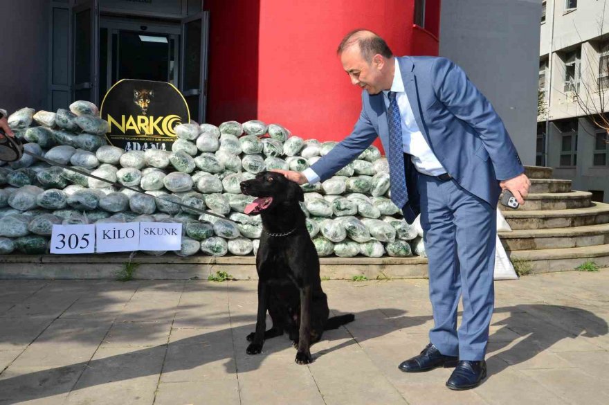Adana Emniyet Müdürü Ahmet Hakan Arıkan ise narkotik şubeye gelerek aramadan 305 kilog uyuşturucu bulan dedektör köpek Uzi'yi sevdi.