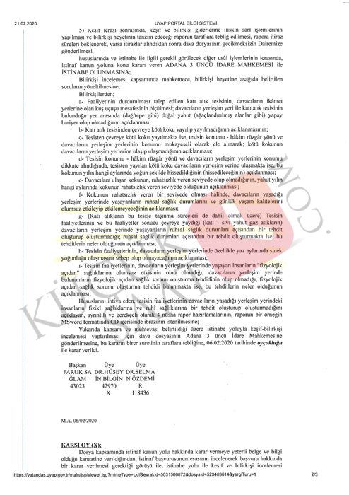 Adana 3. İdare Mahkemesi,ilgili firma ve Adana Büyük şehir Belediyesi arasında yapılan sözleşmeyi esas alarak yapılan başvuruyu reddetmişti. Davanın takibini yapan Sarıçam Platformu Sözcüsü Avukat Bülent Maraklı, mahkeme sonucuna itiraz ederek, kararı Konya Bölge İdare Mahkemesi 2. İdari Dava Dairesi’ne götürdü. İstinaf mahkemesi dosyayla alakalı itirazı haklı görerek bilirkişi incelemesine karar verdi.