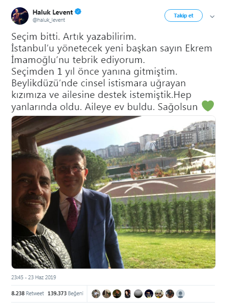 İmamoğlu ile çektiği fotoğrafı paylaşan Haluk Levent, “Seçim bitti. Artık yazabilirim. İstanbul’u yönetecek yeni başkan sayın Ekrem İmamoğlu’nu tebrik ediyorum. Seçimden 1 yıl önce yanına gitmiştim. Beylikdüzü’nde cinsel istismara uğrayan kızımıza ve ailesine destek istemiştik. Hep yanlarında oldu. Aileye ev buldu. Sağ olsun” diye yazdı.