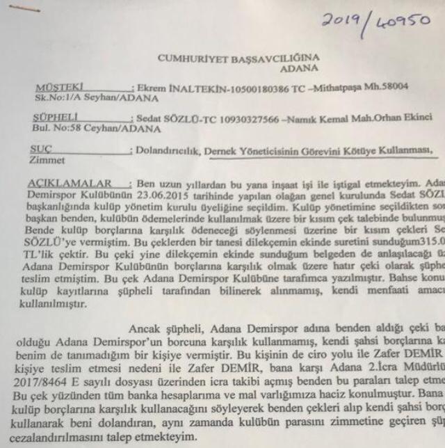 "23 Haziran 2015 tarihinde yapılan Adana Demirspor Genel Kurulu'nda Sedat Sözlü başkanlığında yönetim kuruluna seçildim. Sedat Sözlü benden kulübün borçlarını ödemek için bir kısım çek talebinde bulundu. Ben de kulüp borçlarına karşlılık ödenmesi sözüyle bir kısım çekleri Sedat Sözlü'ye sundum. Bunlardan bir tanesi de ekte dilekçeye koyduğum 315 Bin TL'lik çektir. Bu çek, Adana Demirspor Kulübü'nün borçlarına karşılık 'hatır çeki' olarak yazılmıştır. Bahse konu çek, şüpheli tarafından bilerek kulüp kayıtlarına alınmayıp, kendi kişisel menfaatleri doğrultusunda kullanılmıştır. Kişisel borçları için kullandığı çeki, benim de tanımadığım bir kişiye vermiştir. Bu kişinin de ciro yolu ile çeki Zafer Demir isimli kişiye vermesi nedeniyle, Zafer Demir bana karşı icra takibi başlatmıştır. Bu çek yüzünden tüm banka hesaplarıma ve mal varlığıma el konulmuştur."