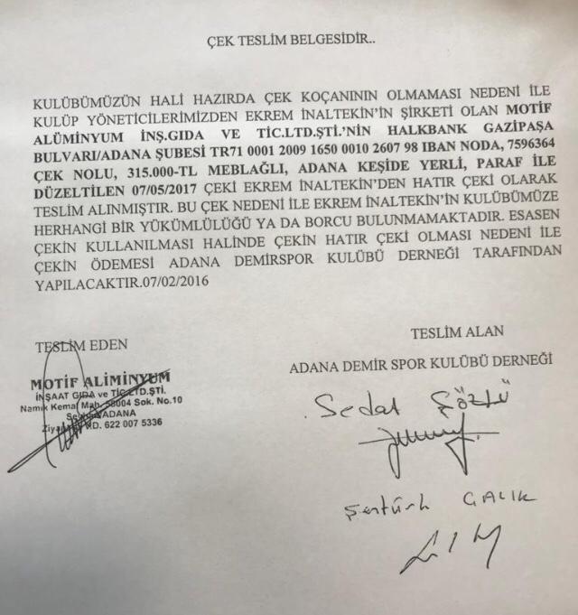 İş insanı Ekrem İnaltekin, Adana Demirspor Kulübü'nün borçlarının ödenmesi için yazdığı çekin Sedat Sözlü tarafından 'zimmete geçirmek, başkanlık görevini kötüye kullanmak ve dolandırıcılık' sebepleriyle Adana Cumhuriyet Başsavcılığı'na suç duyurusunda bulundu.