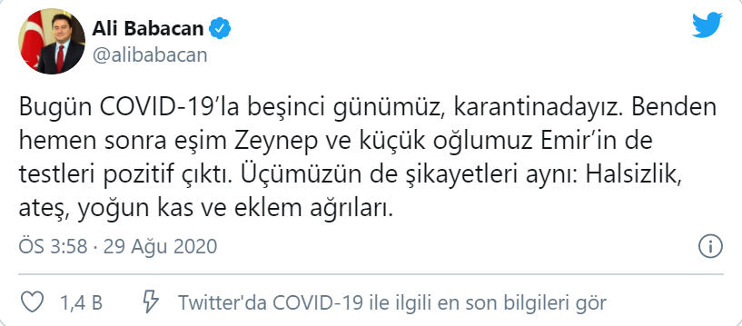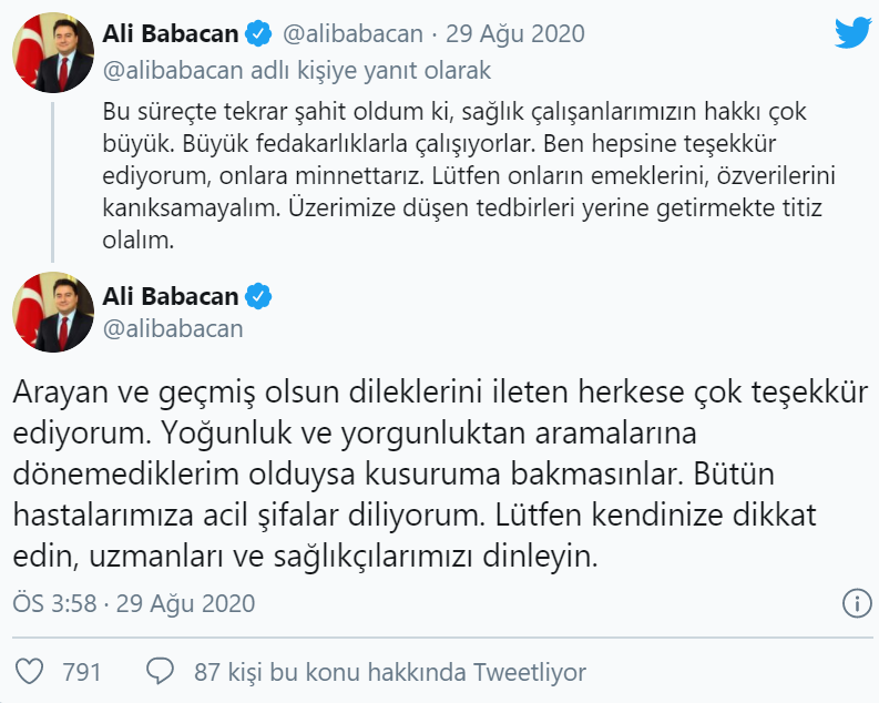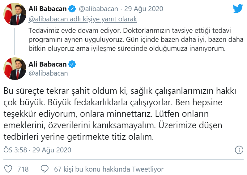 Ali Babacan 25 Ağustos’ta test sonucunun pozitif çıktığını duyurmuş, bunun üstüne siyaset dünyasından Babacan’a geçmiş olsun mesajları iletilmişti.