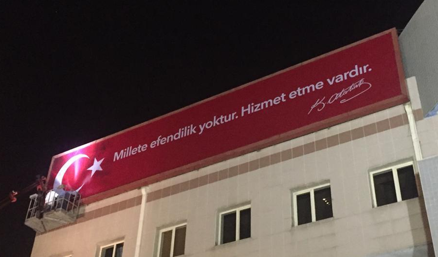 Seyhan Belediye binasına bugün akşam saatlerinde T.C. ibaresi eklendi.