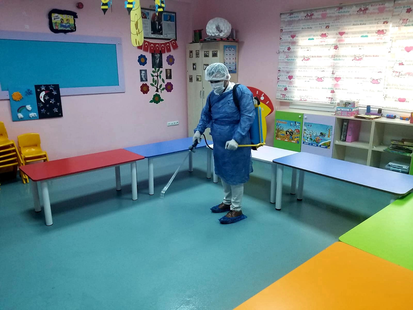 Özellikle minik öğrencilerin bulunduğu kreşler titiz bir çalışmayla ilaçlandı. İlaçlamada benzalkolyum klorür kullanıldı.