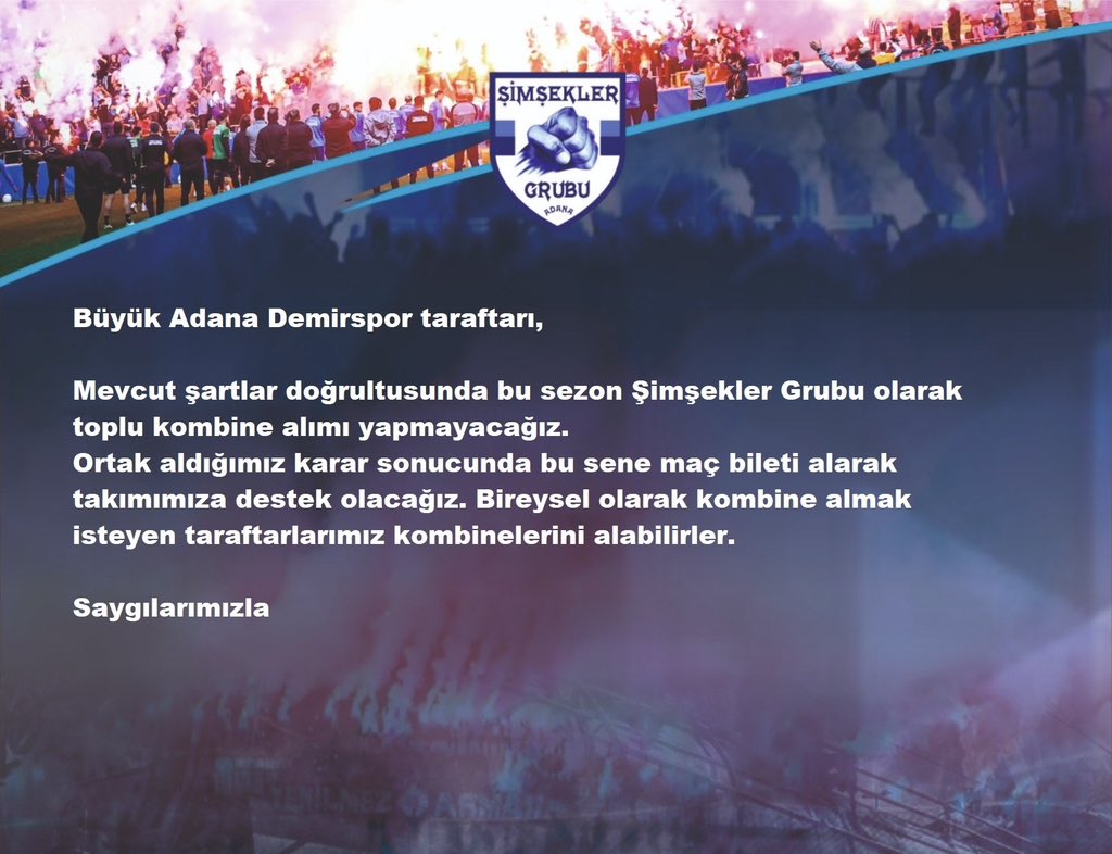 Adana Demirspor'un taraftar grubu olan Şimşekler Grubu, bu sene toplu kombine almayacağını belirtti.