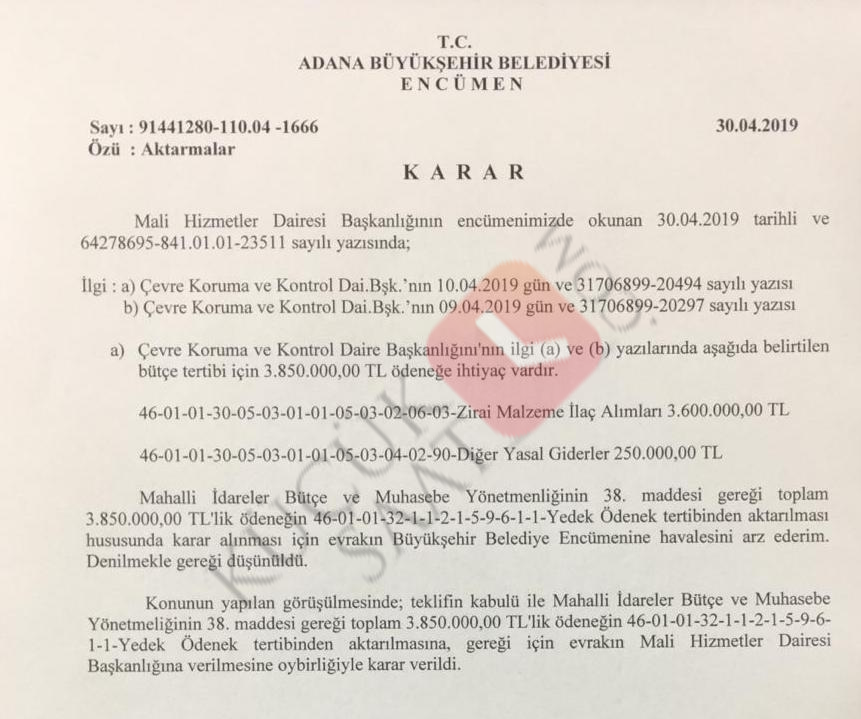 Adana Büyükşehir Belediyesi encümeninde 30.04.2019 tarihinde oy birliliği ile alınan kararla 'sinekle mücadele' kapsamında Mali Hizmetler Daire Başkanlığı yedek bütçesinden Çevre Koruma Daire Başkanlığı'na 3 Milyon 850 Bin TL kaynak aktarıldığı ortaya çıktı.