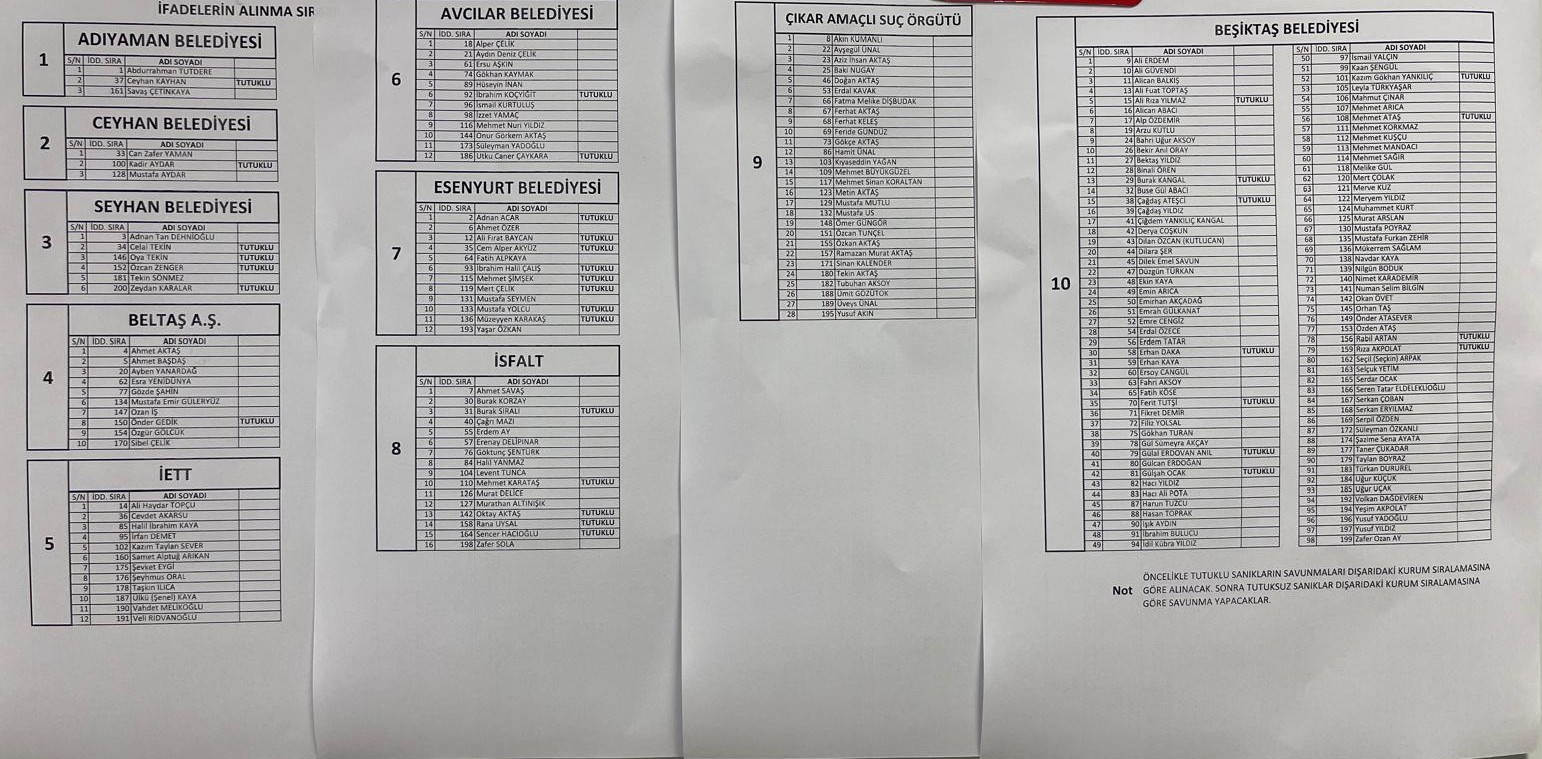 Yarınki duruşmada mahkeme heyeti, "öncelikle tutuklu sanıkların savunmalarının alınması" usulünü izleyecek. Duruşma akışı, listedeki kurum sıralamasına göre ilerleyecek. Adıyaman Belediyesi'nin ardından Adana adına ilk sözü Ceyhanlı sanıklar söyleyecek.