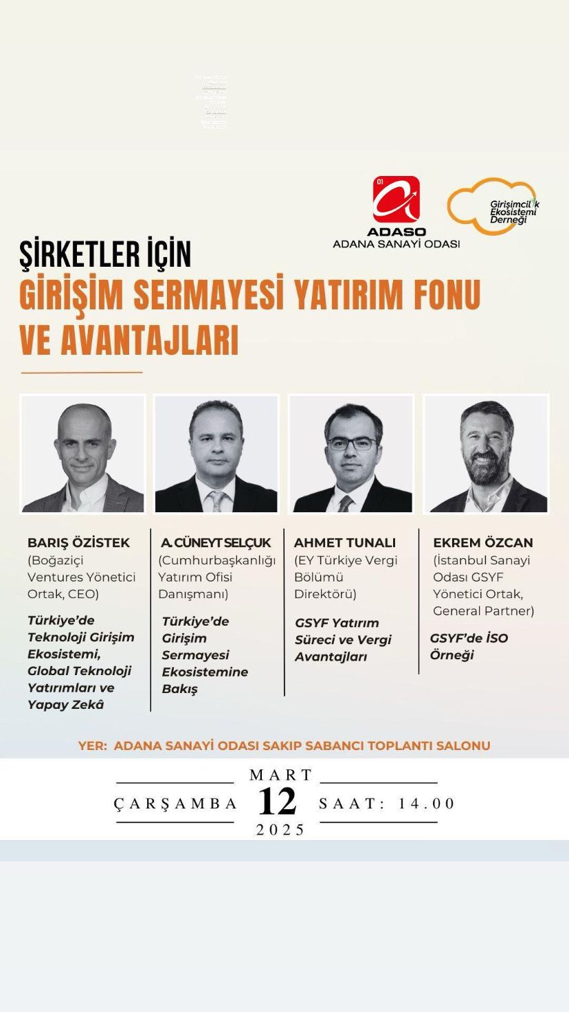 Adana Sanayi Odası ve Girişimcilik Ekosistemi Derneği işbirliği ile ''Şirketler için, Girişim sermayesi fonu ve yatırım avantajları'' programı düzenlenecek. Adana Sanayi Odası Sakıp Sabancı Toplantı salonunda gerçekleşecek program 12 Mart çarşamba günü saat 14:00'da başlayacak.İşte program hakkında detaylar;