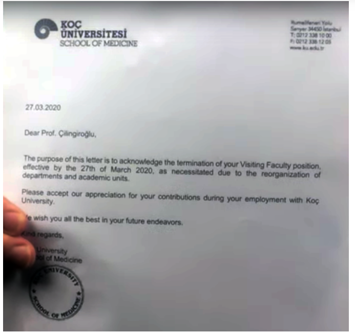 Habertürk'te yeni tip Koronavirüs (Covid-19) salgınına ilişkin son gelişmelerin değerlendirildiği programda yaşanan tartışmayla gündeme gelen, çalışmalarını ABD'de sürdüren Prof. Dr. Mehmet Çilingiroğlu, Koç Üniversitesi tarafından kovulduğunu öne sürdü. Ancak ABD'de yaşayan Çilingiroğlu'un Koç Üniversitesi'nde sözleşmeli bir kadrosunun bulunmadığı, "misafir öğretim üyesi" konumunun da ocak ayında sona erdiği öğrenildi.