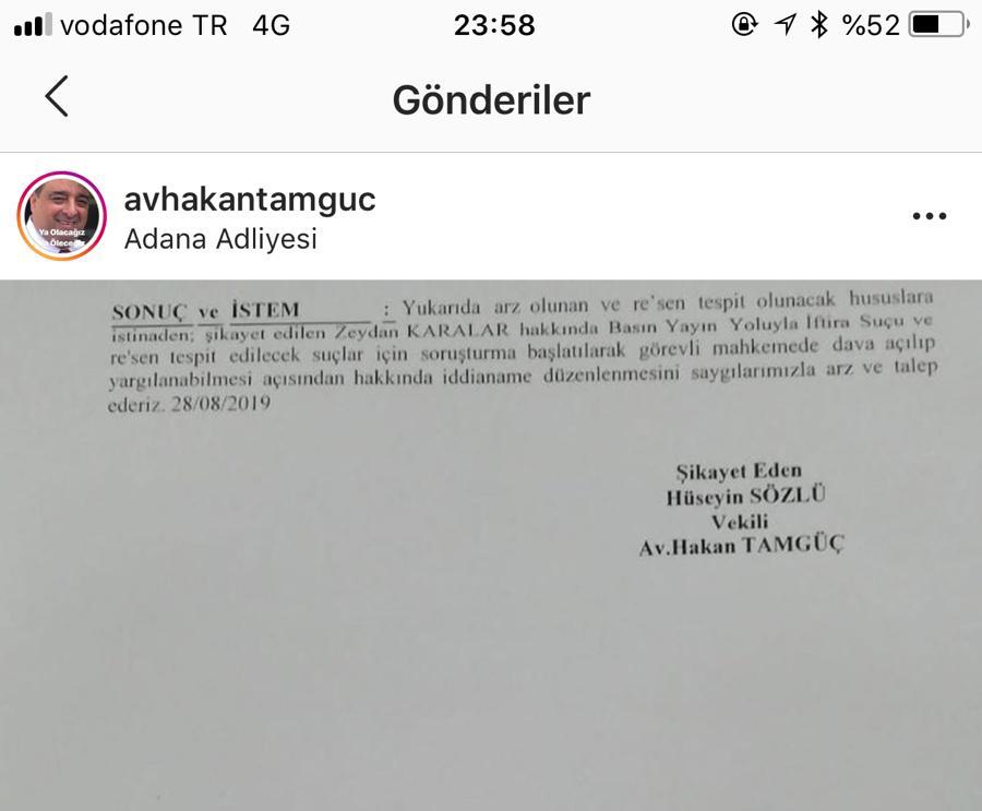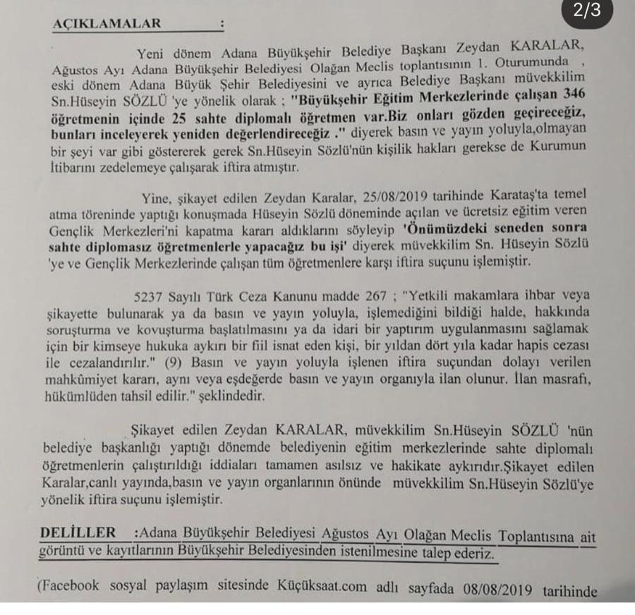 Hüseyin Sözlü'nün avukatı Hakan Tamgüç yaptığı açıklamada, "Hüseyin Sözlü ve Adana Büyükşehir Belediyesi Gençlik Merkezleri öğretmen emekçilerini töhmet altında bırakan açıklamaları nedeniyle Zeydan Karalar hakkında Basın ve Yayın yoluyla iftira suçu işlediği iddiasıyla tarafımızdan, Adana Cumhuriyet Başsavcılığı'na suç duyurusunda bulunulmuştur. Kamuoyuna saygılarımızla." dedi.