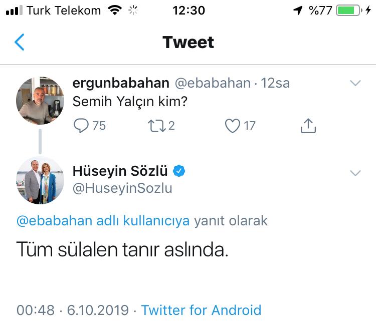 Sözlü, Babahan'ın "Semih Yalçın kim?" tweetine yanıt olarak, "Tüm sülalen tanır aslında" yanıtını verdi.