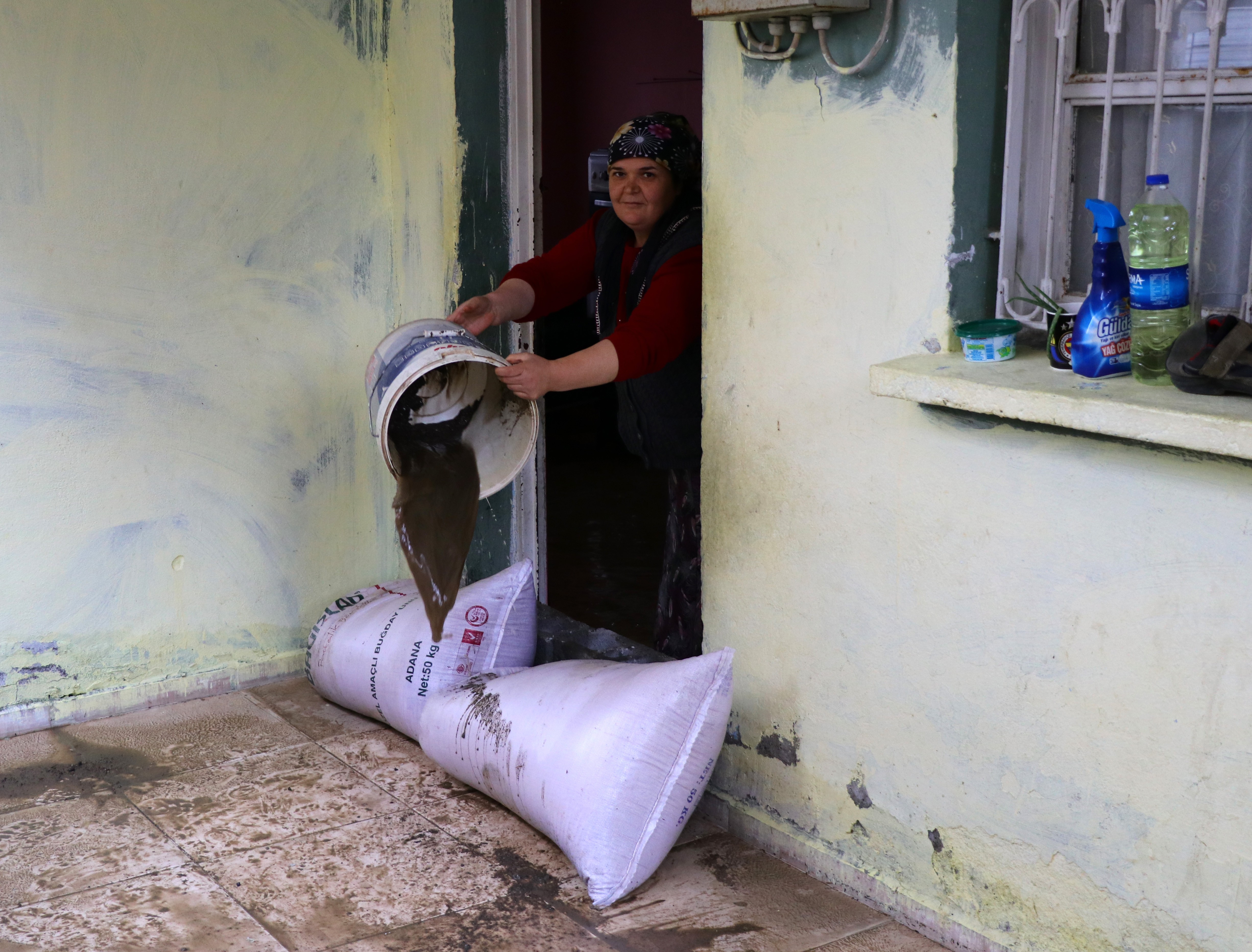 Gün içerisinde mahalleye gelen belediye ekiplerinin suyu bir miktar çekmesiyle temizliğe başlayan mahalleli, evlerinin içine su girmesin diye de kapılarının girişine kum çuvalı ve briket koydu.