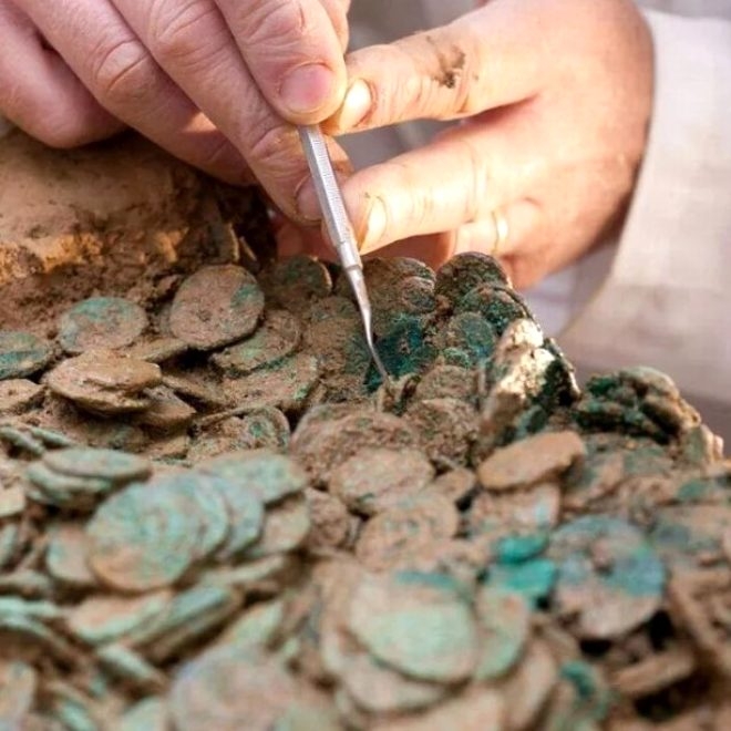 Uzmanlar tarafından dikkatle taşınan tabutun içinden binlerce sikke çıktı.