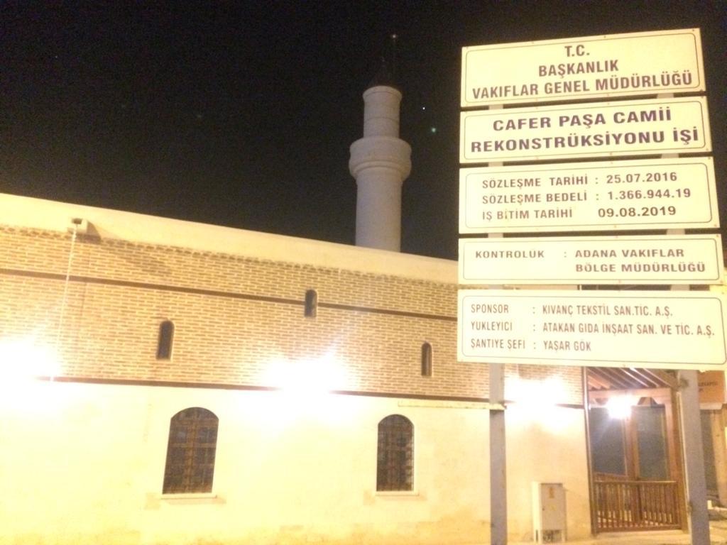 1649'da yaptırılan ve 1950'de yol yapımı sırasında yıkılan Cafer Paşa Camisinin bulunduğu alan ve temelleri, Adana Vakıflar Bölge Müdürlüğü'nün yaptığı çalışmada gün yüzüne çıkarıldı. Adana Kültür Varlıklarını Koruma Bölge Kurulunun kararıyla, eski Adana fotoğraflarında Taşköprü'nün batı tarafında görülen caminin rekonstrüksiyon yapılarak ihya edilmesi çalışması tamamlandı. Cami kalıntılarının bulunduğu alanın koruma altına alınmasının ardından Kıvanç Tekstil A.Ş. Yönetim Kurulu Başkanı Zeki Kıvanç ve Kıvanç ailesi tarafından Cafer Paşa Cami'si aynı yerde, yeniden inşa edildi.