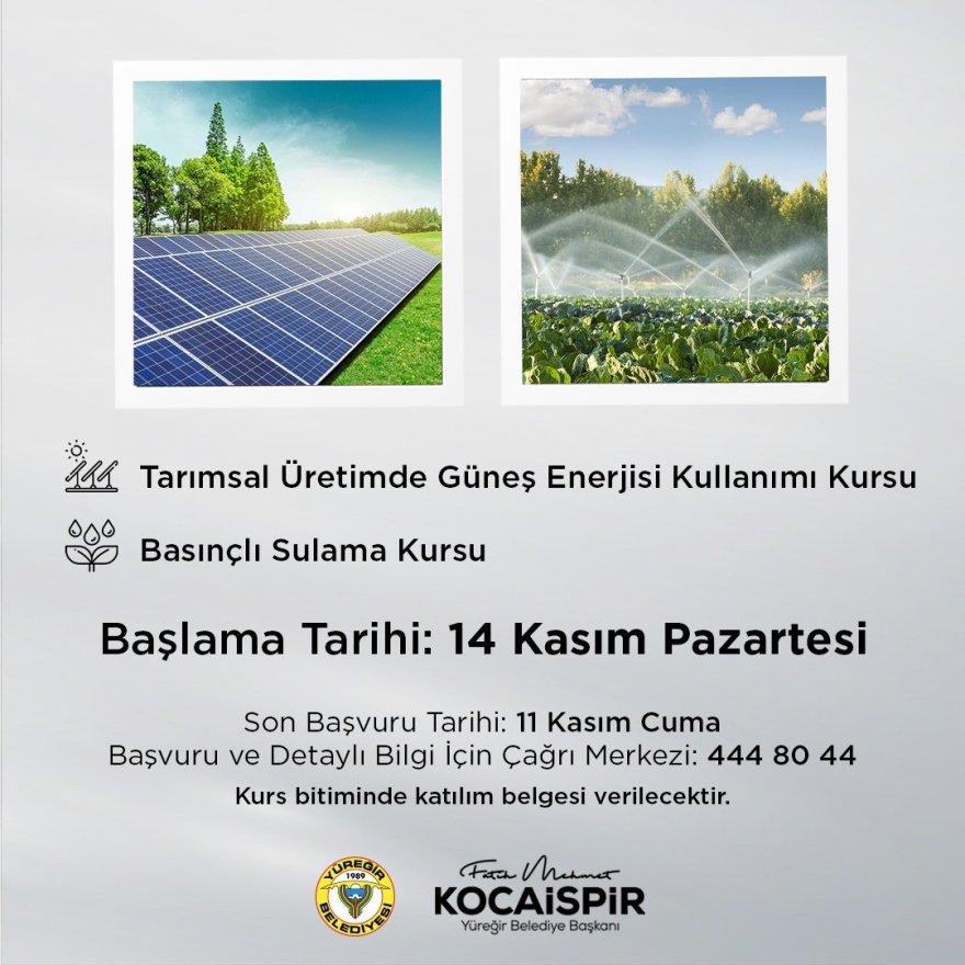 Yüreğir Belediyesinin "Tarımsal Üretimde Güneş Enerjisi Kullanımı Kursu" ile "Basınçlı Sulama Kursu" 14 Kasım Pazartesi günü başlıyor.