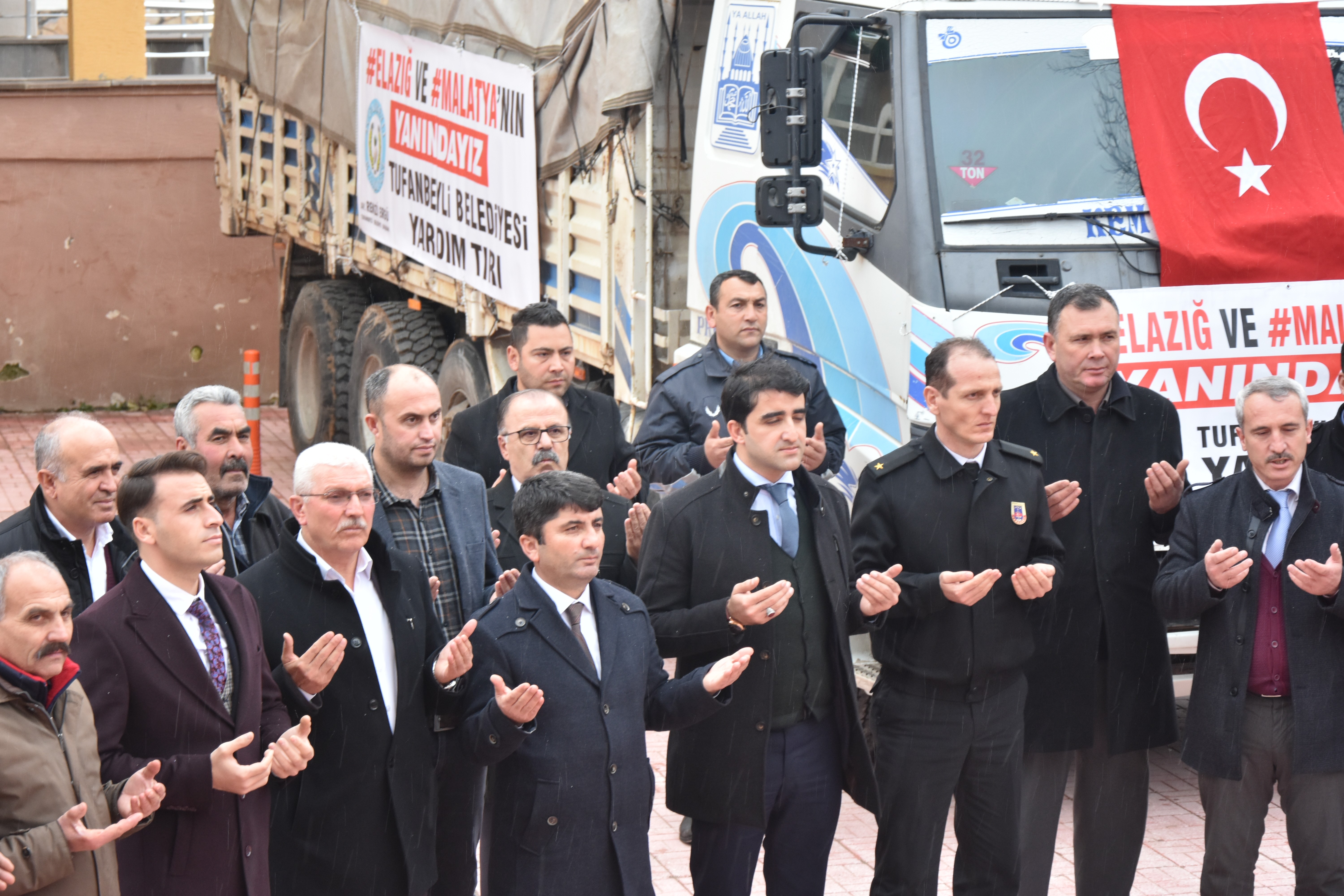 Tufanbeyli belediyesi belediye önünde düzenlenen törenle İlçe Kaymakamı Ömer Sevgili, Belediye Başkanı Remzi Ergü, belediye meclis üyeleri ve kurum amirlerinin katılımı ile yardım tırı Elazığ'a yolcu edildi.