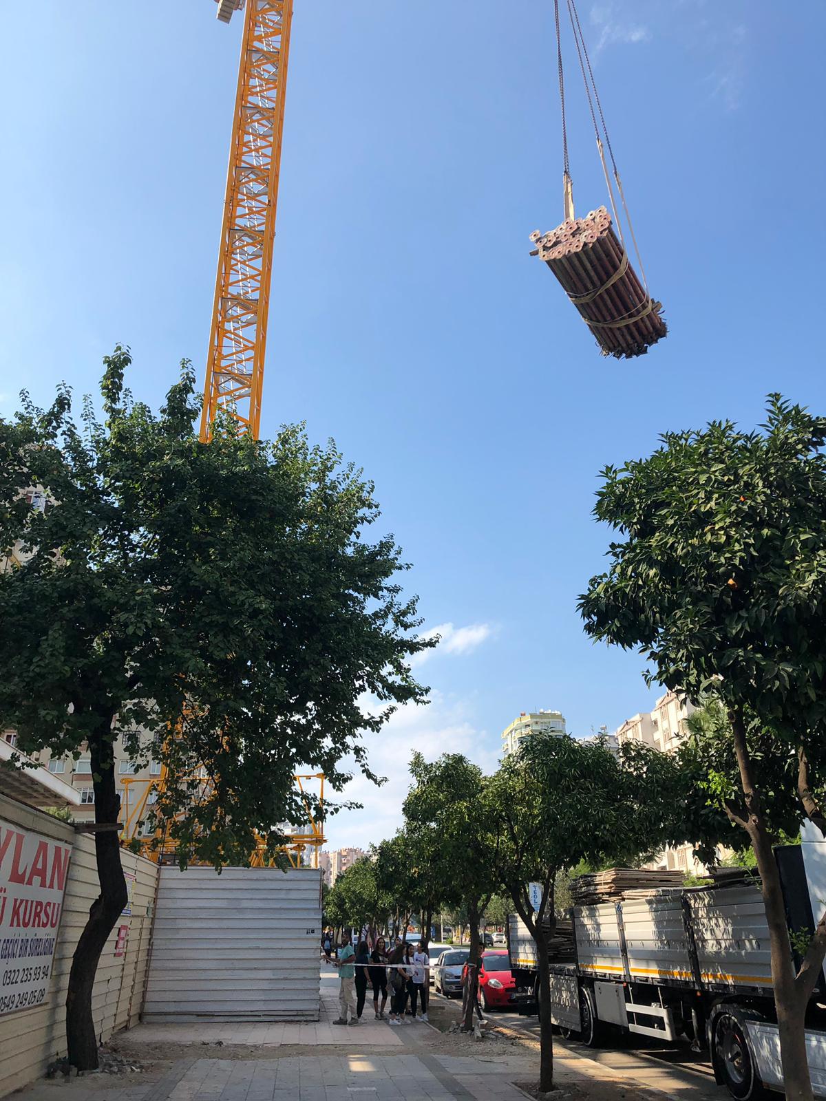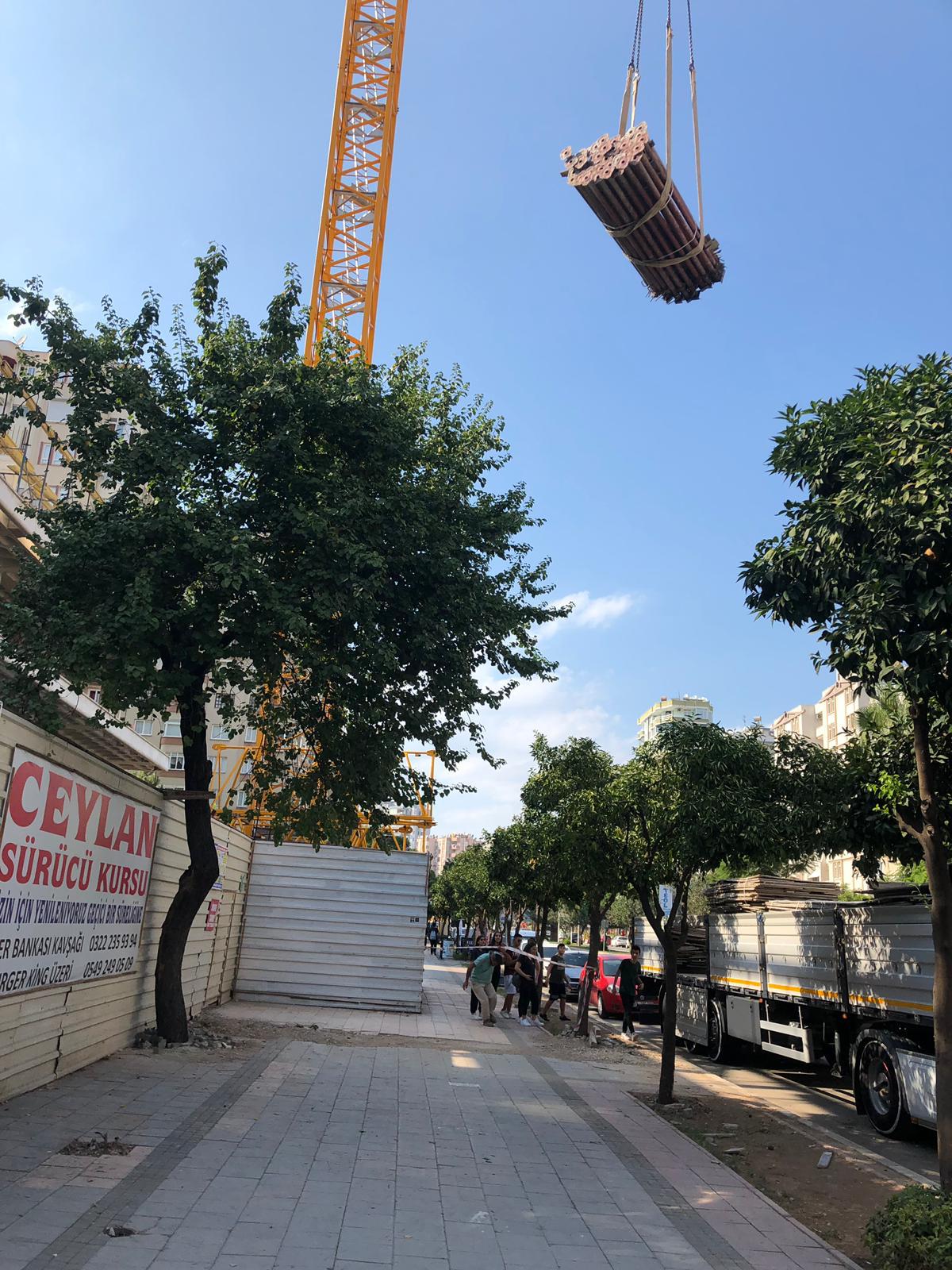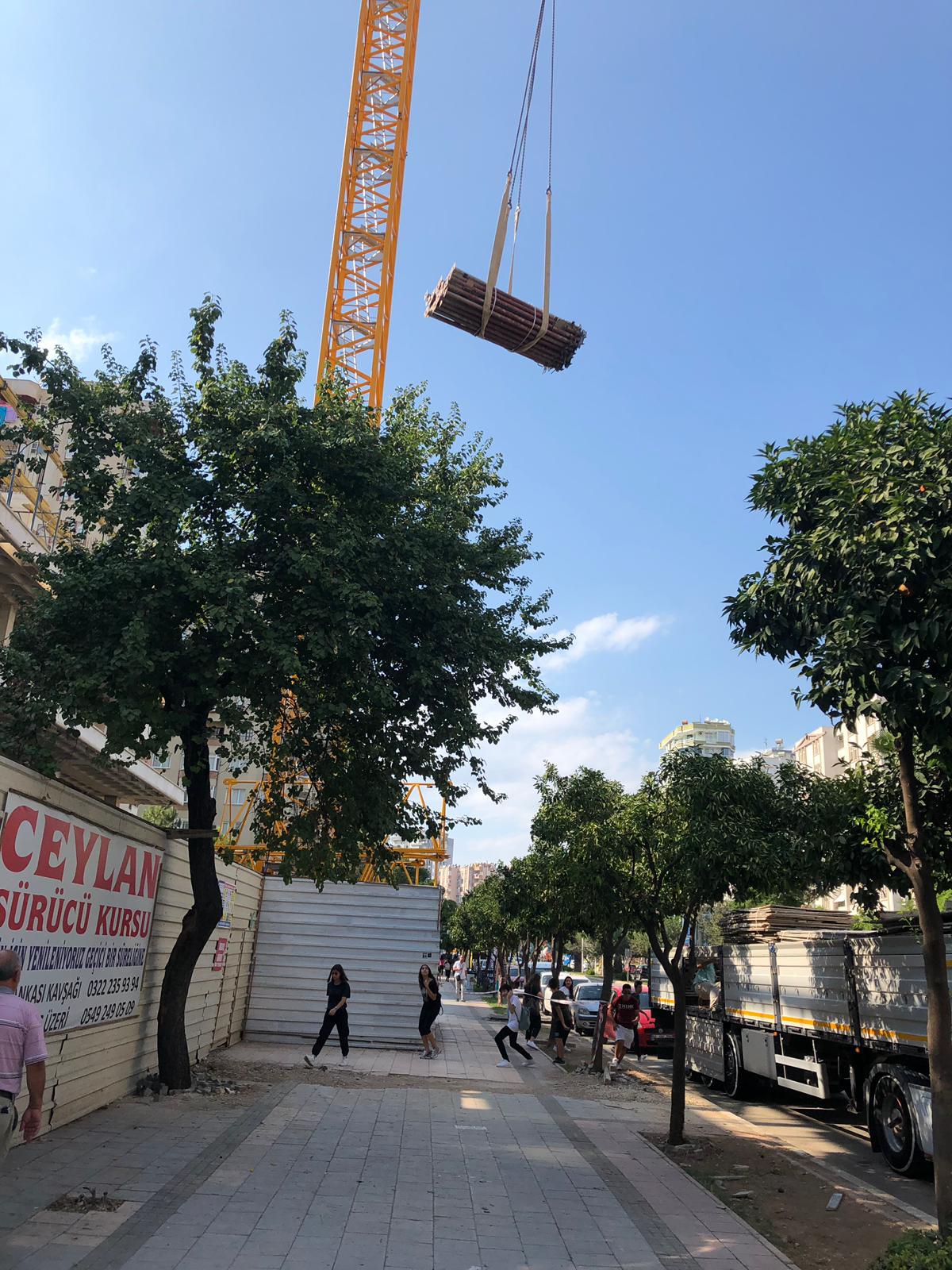 Turgut Özal Bulvarı kenarına park eden bir tırdan kule vinç ile alınan malzemeler inşaat alanına taşındı. Çalışma yapılan inşaat alanı ile yol kenarına park eden tır arasında bulunan bulvar üzerindeki kaldırım yayalar tarafından oldukça yoğun kullanıldığı bilinmesine rağmen inşaat çalışmalarını yürüten sorumlu firma tarafından sadece bir emniyet şeridinin çekilmesi ve bunun haricinde hiç bir güvenlik önleminin alınmaması dikkat çekti.